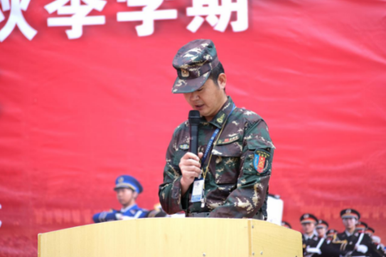 在教学楼前,教官武国昌围绕“团结、奉献”致辞,呼吁大家“将集体的力量发挥得淋漓尽致”。